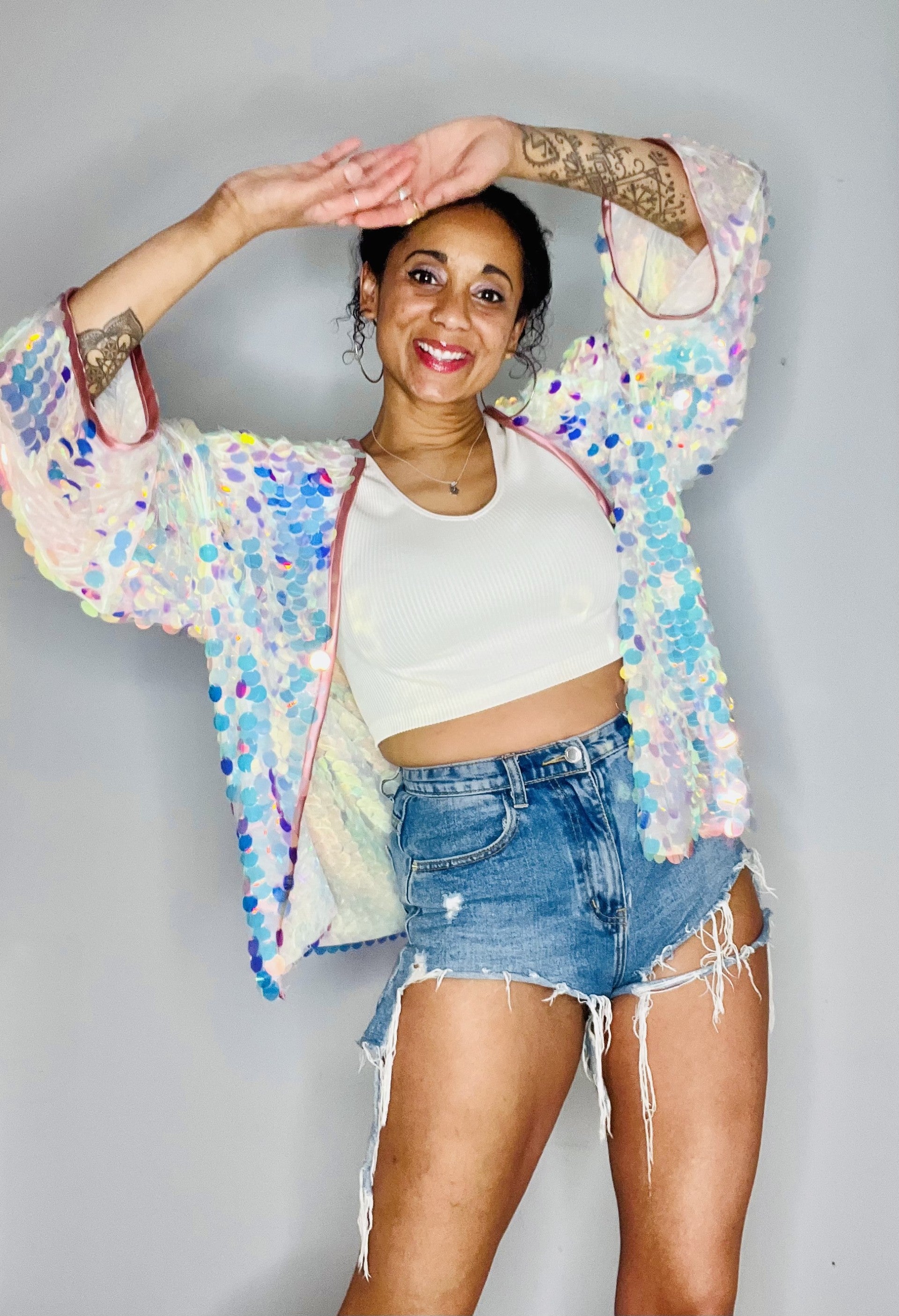 Beautiful, show-stopping handmade sequin kimono, perfect for parties, festivals or adding sparkle to any special occasion.